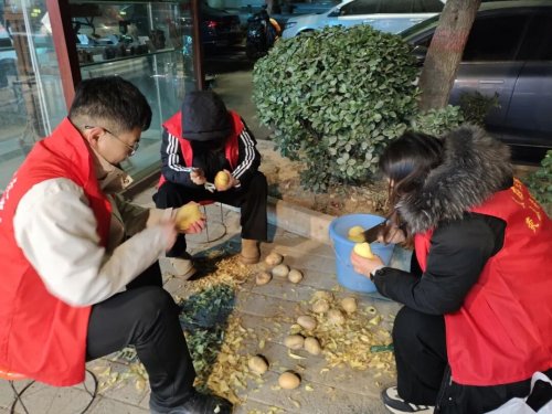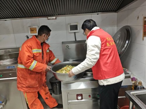凌晨 4 点多,天还未亮,大雪纷飞,道路湿滑。阔哥便带领团队成员整装出发,经过一个多小时的冒雪赶路,于 5 点半准时抵达杜岭爱心驿站。没有片刻休整,大家便迅速与现场的志愿者们汇合,投入到爱心早餐的筹备中。洗土豆的盆里水花四溅,切菜的案板上叮当作响,生火、炒菜、熬粥的环节有条不紊,阔哥身先士卒,与公司小伙伴们、现场志愿者们默契分工、高效协作,每个人的动作都娴熟而认真。冰冷的自来水、弥漫的油烟、忙碌的身影,在昏暗的灯光下交织成一幅温暖的画面。尽管双手被冻得通红,额头却渗出细密的汗珠,但每个人的脸上都洋溢着真诚的笑容 —— 这份笑容,源于对公益的执着,更源于携手助人的同心与喜悦。